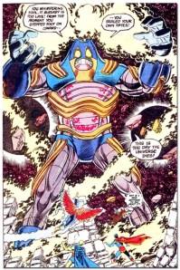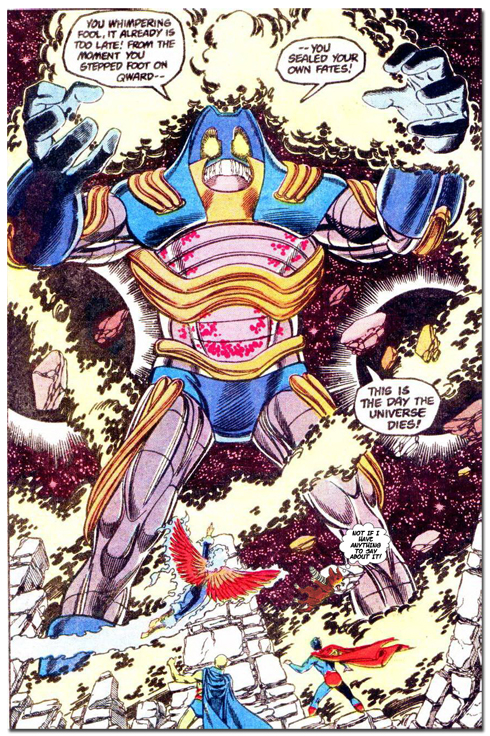 Eventually, The Monitor dies (issue 4) but that doesn’t spell the End of Everything because DC Comics’ heroes team up to face the Anti-Monitor three times.  First, they attack him in the anti-matter universe and Supergirl nearly destroys him before dying herself (issue 7).  Next, after fighting a massive war against an army of Lex Luthor and Brainiac-led villains that’s right out of the best Challenge of the Super-Friends episodes ever (issue 9), they travel to the dawn of time to stop the Anti-Monitor from changing history (issue 10).  Finally, the Anti-Monitor gets completely fed up and pulls Earth into the anti-matter universe in an effor to destroy it (issue 12).