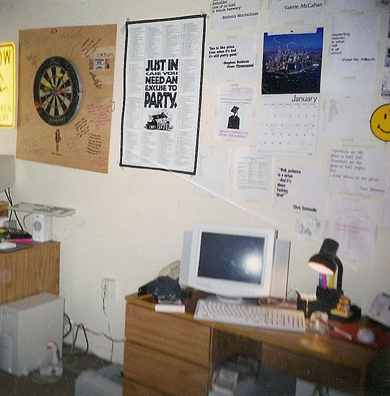 Really, that was it. The idea that I had to buy some sort of chair or crazy-looking wall clock was completely foreign. I kinda just packed away as much as I could (left the comic collection at home), shoved it into my parents’ car, had an incredibly long and teary conversation with my girlfriend, and headed to college (stopping only at the Grover Cleveland Service Area on the New Jersey Turnpike, where I threw up my breakfast in the parking lot … I guess you could say I was a little bit nervous about leaving home). When we arrived on campus and I got all of my keys and forms, I unpacked, made my bed, and that was about it. Sure, I put up a few pictures of friends from home but you didn’t exactly see me hanging up tapestries and collages. That would all evolve organically as I wound up putting posters, pictures, and what was probably a few hundred pieces of paper filled with “important” quotes all of the walls of the back room of room E-110 in Wynnewood Towers.