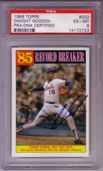 A 1986 Topps "'85 Record Breaker" for Dwight Gooden. Sadly, I do not own a signed and graded copy of this card.