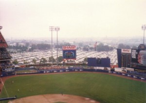 If you have ever had to travel by Flushing Meadows by car from out on Long Island, you know that it’s a haul.  Not only do you have to contend with the traffic typical on the LIE or Northern State, you were likely to run headlong into a backup on the Grand Central Parkway near the stadium.  We had a way around that because we stopped at my grandmother’s house in New Hyde Park and then went on from there, although there was a little bit of doubt about whether or not the game would be played because it had rained in the morning and the tarp was on the field at Shea.