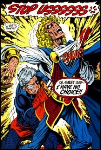 There it is! Right in print! I didn’t even need to buy any of the issues if I didn’t want to because I found out exactly what happened and then some (I’ll get to the whole Baby Wildebeest nightmare next month) in the pages of another comic. I mean, I’ll still give Marv Wolfman credit for going over-the-top with the drama and superhero language (beacuse nobody but a comic book character screams “OH SWEET GOD I HAVE NO CHOICE!” while killing his son), and rereading the story nearly two decades later, any spoiler sourness has worn off and it works very well.