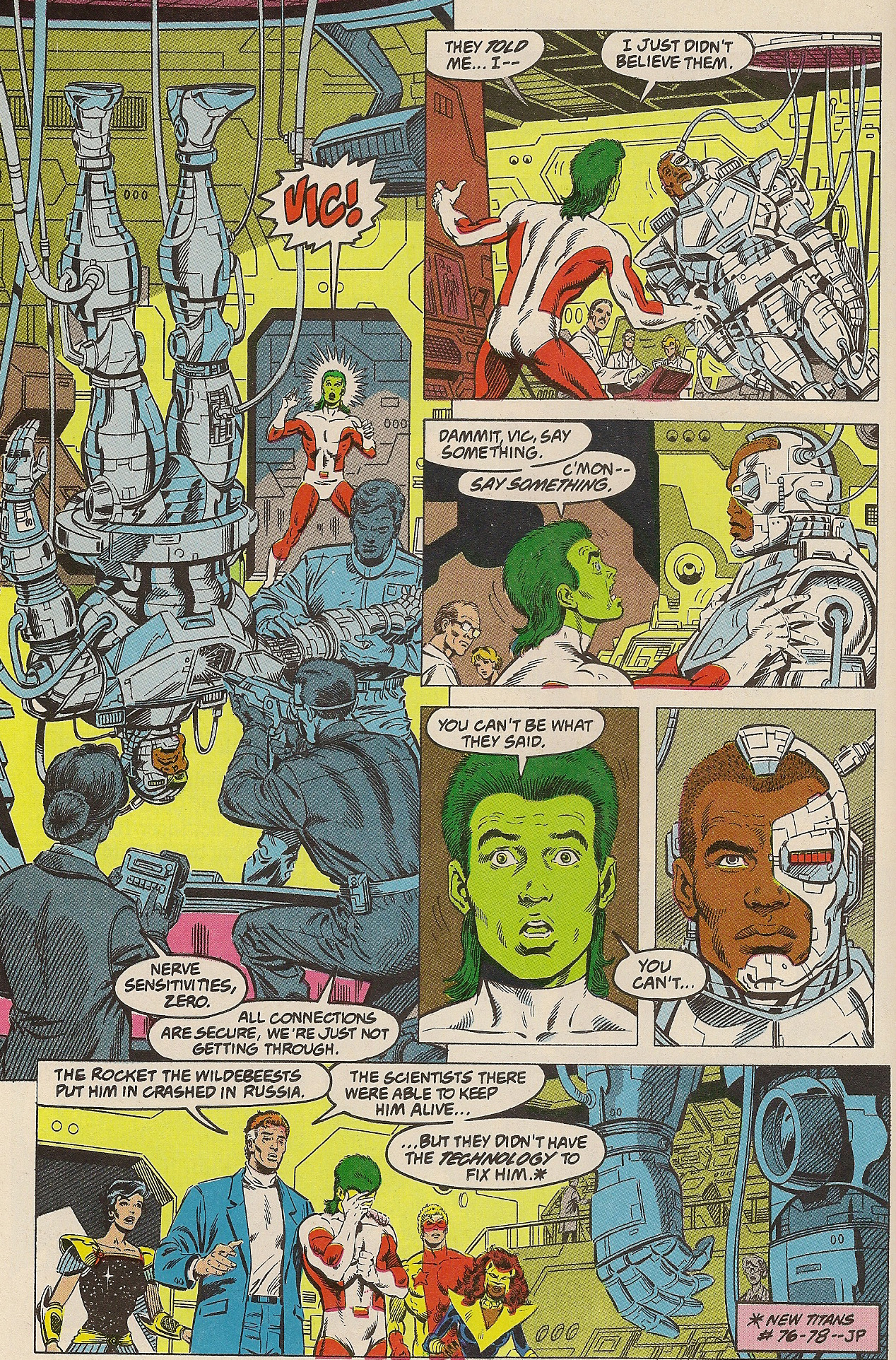 I can imagine that this was one of those moments that longtime Titans fans were curious about or dreading ever since Vic Stone’s rocket blew up at the end of issue 75 and he walked through the Russian science complex in a new suit but completely catatonic in issue 77. Vic and Gar’s friendship was one of the key relationships in the team and to have this broken up was going to cause major reprucussions, especially for Gar, who was the youngest Titan and resident smartass. In fact, as we go through the next 50 issues of the title, we will see Mr. Logan become so wayward that he becomes a villain and that starts on page eight of issue 85 when he sees what has become of his friend and is shocked that when they told him Cyborg was a vegetable, they weren’t kidding.