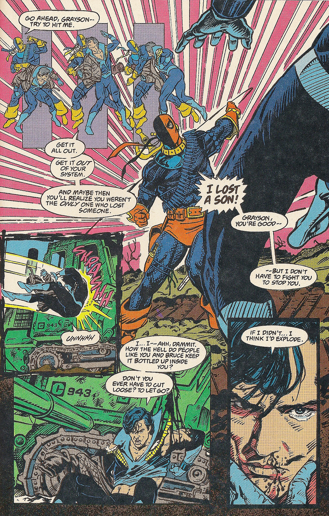 Grayson respons true to character: “I … I –Ahh, dammit. How the hell do people like you and Bruce keep it bottled up inside you? Odn’t you ever have to cut loose? To let go? If I didn’t … I think I’d explode.” Doon after, they part ways. Deathstroke’s story continues in the first issue of his own series and we’ll see Dick Grayson’s life gradually unravel until he walks away from the Titans in 1994.