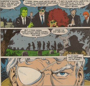 So it is with “Titans Hunt/The Jericho Gambit.” At the end of New Titans #84, the Titans have escaped what’s left of Azareth and are sitting around wondering: a) what the hell just happened, b) what’s going to happen next, and c) does anyone have some clothes we can borrow? When “Dirge” begins in issue #85, what happens next is Jericho’s funeral, which Slade Wilson does not officially attend (he chooses the tried and true tactic of being in the cemetery but staying far away from everyone) and that leads to resentment from our heroes, who are already acting self-righteous because he killed his own son. Then again, you can kind of excuse it because they’re obviously working through some serious grief.