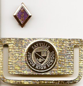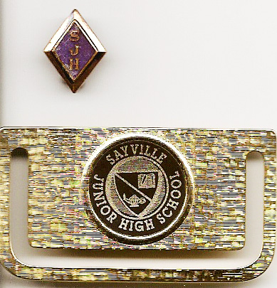 The SJH pin and Sayville Junior High money clip (or is it a bookmark?) that I received for honors during my time in junior high.