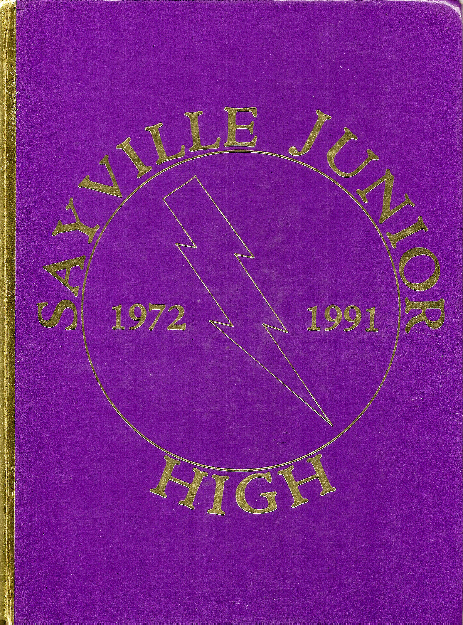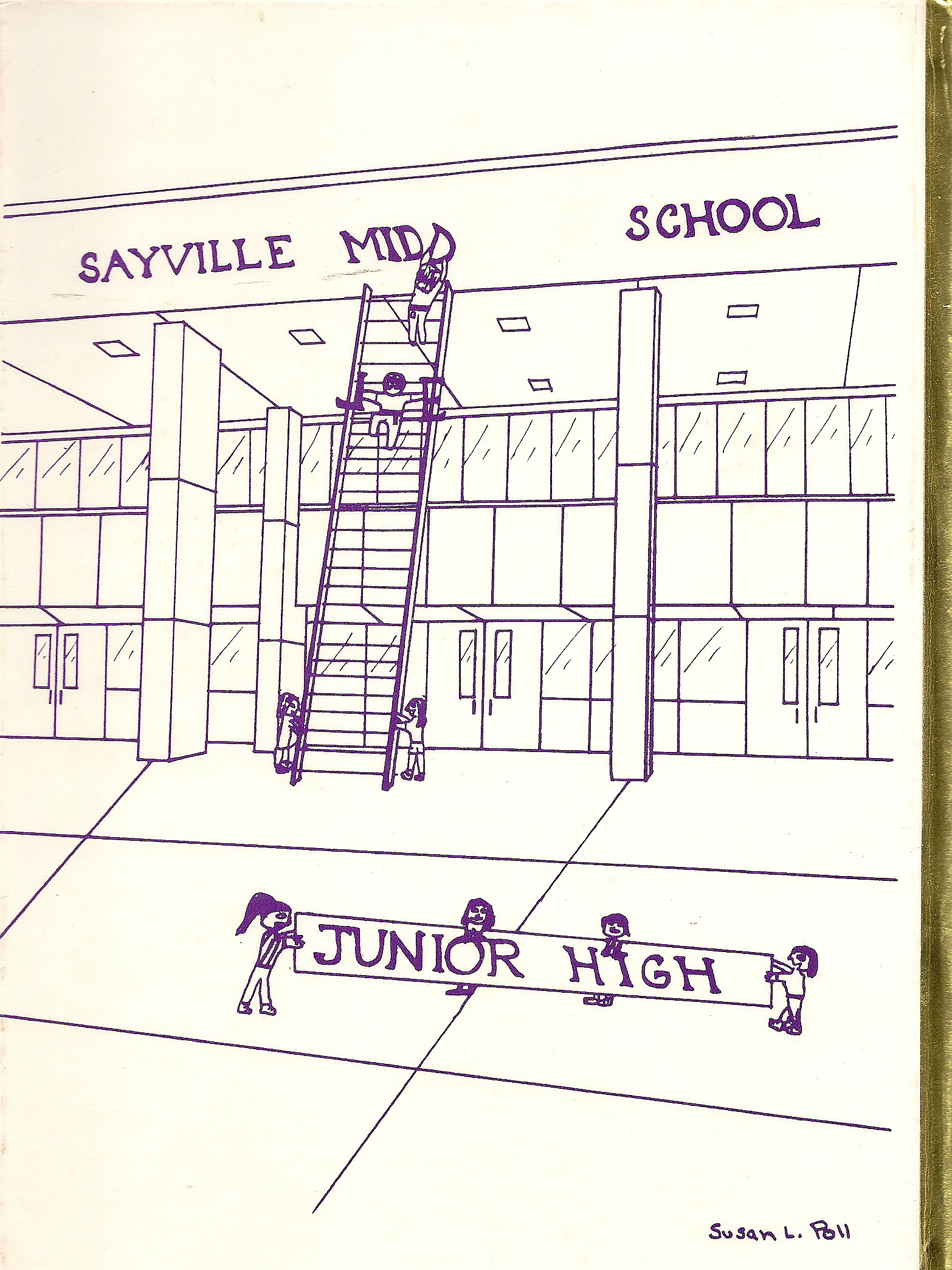 As far as I remember, my junior high yearbook staff did not go to McDonald’s, but I do remember the day the book arrived because we collectively spent an entire afternoon coloring in a ribbon on page one with yellow highlighter. It was a dedication page to the soldiers of Operation: Desert Storm that Mr. Young and other staffers had created in a brand new computer program called Arts & Letters and printed out the entire page on a brand new Hewlett-Packard laser printer that took what seemed like five minutes to print a single page. The top was a yellow ribbon and the second half of the page contained a poem called “The Soldier” written by Alexandra Vincent that had an army medal behind it. I think we each colored in 50 of those ribbons, but the sweet reward was getting to take the book home early and we probably wouldn’t have taken so long to color everything in if we hadn’t been ogling the cover, which purple with a gold spine and “Sayville Junior High 1972-1991” around a gold lightning bolt seal. On the back was a drawing of workers taking down the “junior high” sign and putting the words “middle school” on the front of the building.