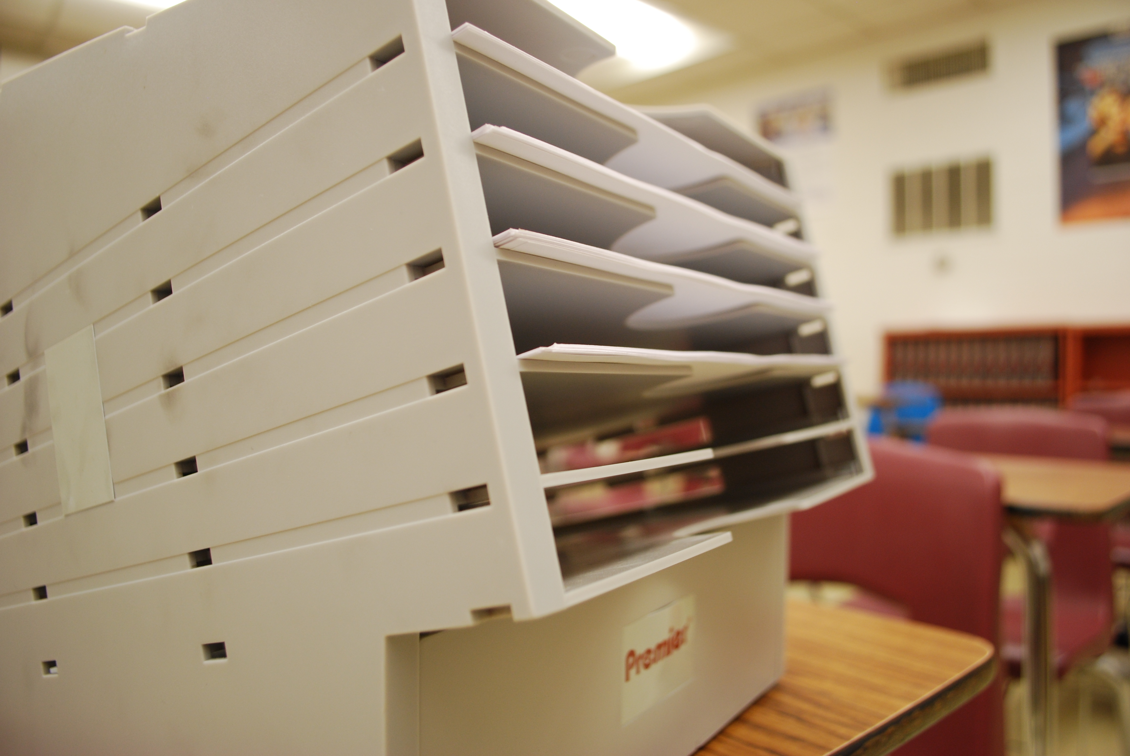 Grab it from the faculty lounge and carry it down the hall and most of the people you pass will look at the CL6 and ask, “What is that?” Honestly, it’s an odd-looking device—a big gray box with slots for stacking papers and a handle for pulling them forward. Even I can’t help but wonder where it came from, because it seems like something dug up from the 1980s. For all I know, it was sitting in the school storage closet with an old mimeograph, collecting dust and someone picked it out of the other velveteen office rabbits to be used again.