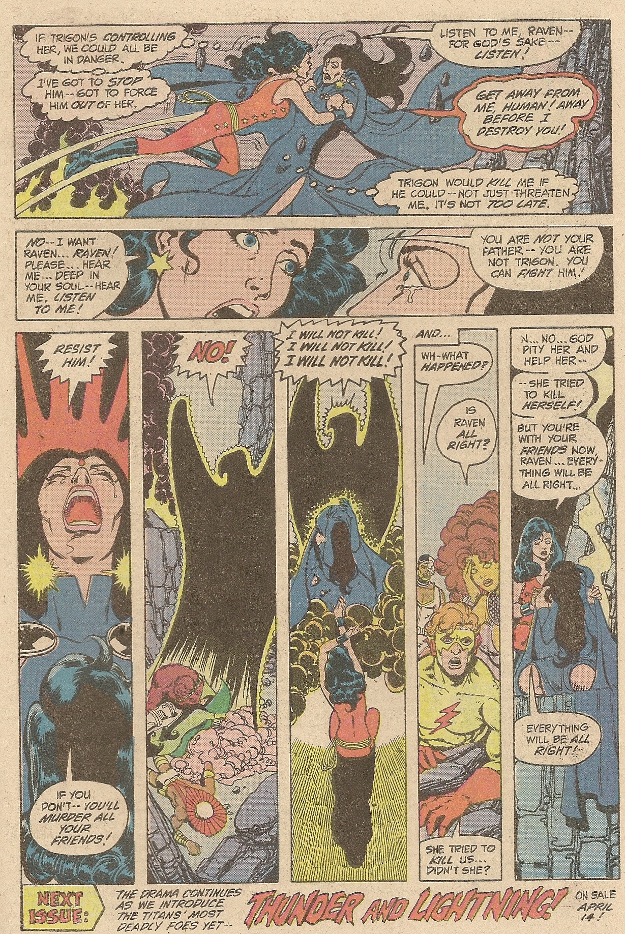 Since Raven’s an empath and Blood literally walks through her use of her powers on him, the Brotherhood of Evil goes after her and kidnaps her to try and find out what the heck is Blood’s secret. Their torture of her in issues #30-31 doesn’t reveal anything except that Trigon (who we’ll see again in the first issues of the Baxter series) is a threat and if she is to get angry he will probably possess her and that will be the end of everything. In fact, the cover of New Teen Titans #31 says “Raven Berserk!” and she does come very close to killing the members of the Brotherhood, but resists and fights Trigon off. She also scares the living shit out of Kid Flash, but that is another story.
