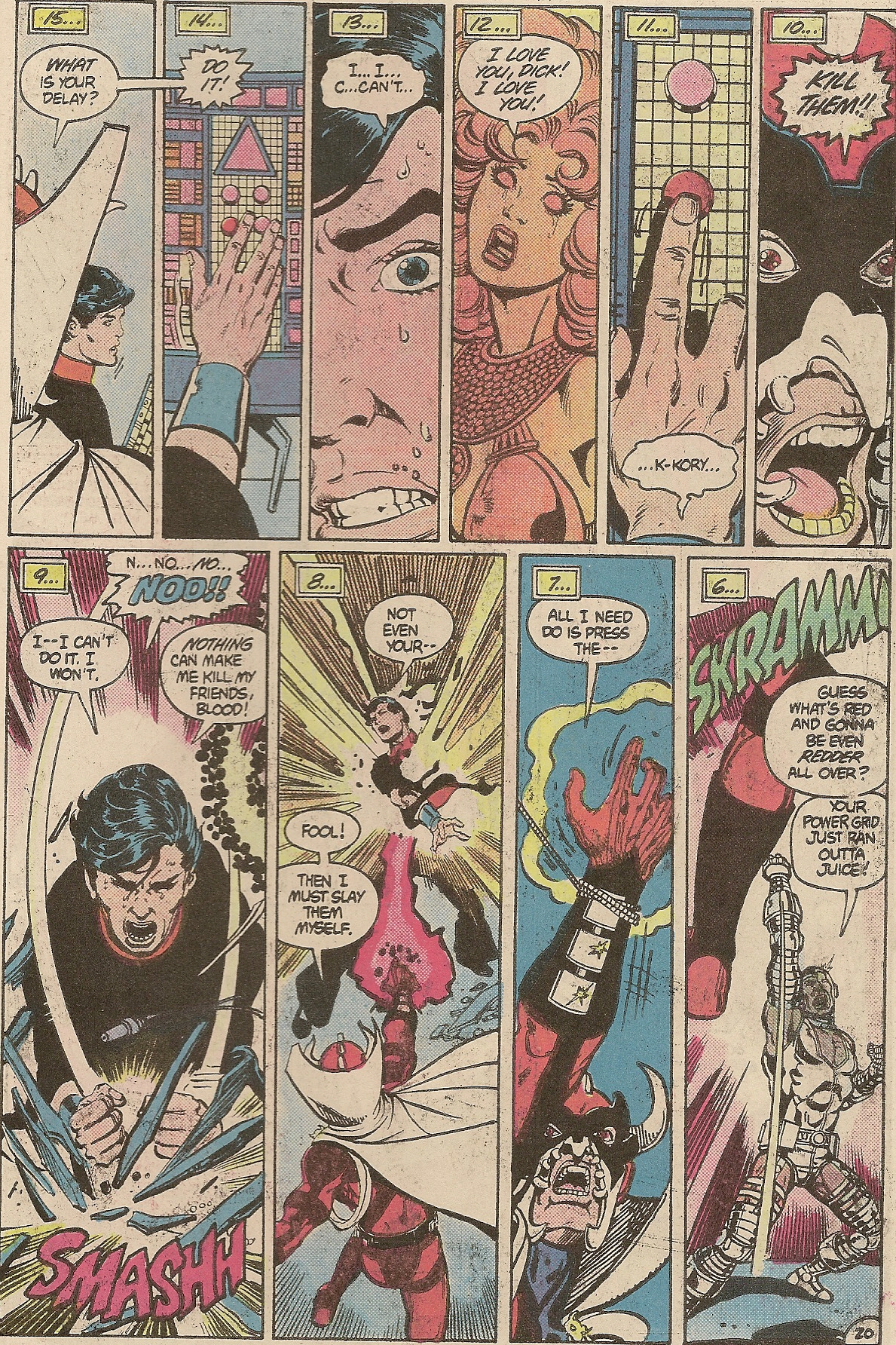 Kory and Dick love one another so much that they can use that love to overcome brainwashing from a cult. Tales of the Teen Titans #41.