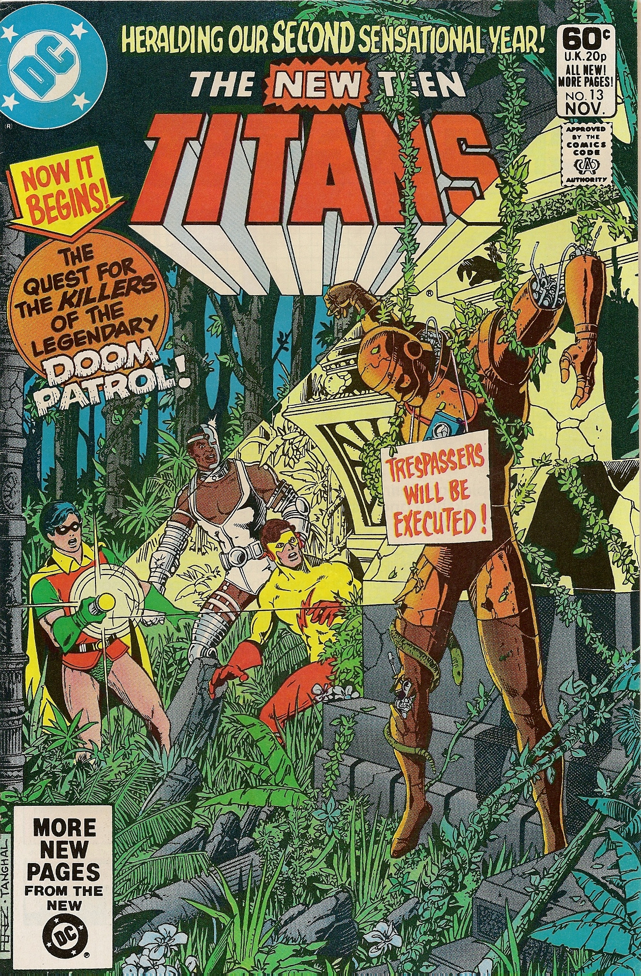 Fast forward to 1981-1982 and Beast Boy is now Changeling and is part of the New Teen Titans; one of the DP members, Robotman, has been found and “resurrected” (I mean, he’s a robot, so it was plausible); Mento is missing; and the Doom Patrol’s killers are still at large. New Teen Titans #13 opens with Robin, Cyborg, and Kid Flash looking for said killers and Mento in the jungles of Africa. They find a dismantled Robotman and eventually they find Dayton, who has gone nuts for the first (but definitely not the last time), as well as Madame Rogue and General Zahl. It is in this three-parter that we also have the first appearances of the Brotherhood of Evil and the nation of Zandia, which would both inform the Dick-Kory-Raven triangle (of sorts, anyway) that rears its head in issue #100.