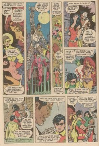 But what’s more important to the story is that Robin spends most of his time being very angry that Starfire is in trouble and he eventually realizes that he is in love with her and the two begin dating. They become one of those “class couples” of the DC Universe for a number of years and definitely are the key romantic couple of the Titans (Okay, there’s Donna and Terry, but … uh … yeah) and if Wolfman was creating a soap opera with super heroes he definitely had a major couple going and would honestly spend the better part of a couple of years breaking them up and getting them back together again. Here, the beginning of their relationship seems pretty organic, like it wasn’t rushed, even if it is pretty simple. I can appreciate that, especially considering the complicated mess that the title would become after George Perez’s departure in 1984.