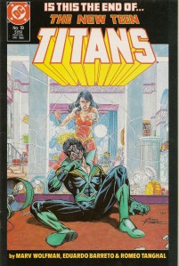 So the Titans were popular when I was a teenager, but not that popular. Sure, Jon Peterson’s editorial run put the book back in the spotlight with enough cache to warrant two spin-off titles with an “event” crossover between them, but they weren’t so popular that comics shops were charging ridiculous amounts of money for their back issues. The Wolfman-Perez run on the book, which started in 1980 and ran until 1984 (or 1985-1986 if you factor in, by extension, Crisis on Infinitie Earths) is now one of those “classic” runs, something that comics fans put up as one of the best of that particular period (I don’t know if I’d say the best of all time because then you wind up in Lee/Kirby territory and I think that’s still considered blasphemy. Anyway …) but Marv Wolfman and George Perez are not Todd MacFarlane, Jim Lee, or Rob Liefeld whose backstock on the X-Men and Spider-Man were selling for prices in the double-digits. I should know … I’m the jackass who once paid $25 for a copy of Uncanny X-Men #248. So like I said, I got most of the original New Teen Titans series for about $2-$3 an issue, with the occasional issue, usually a very early one or a Deathstroke appearance, costing more.