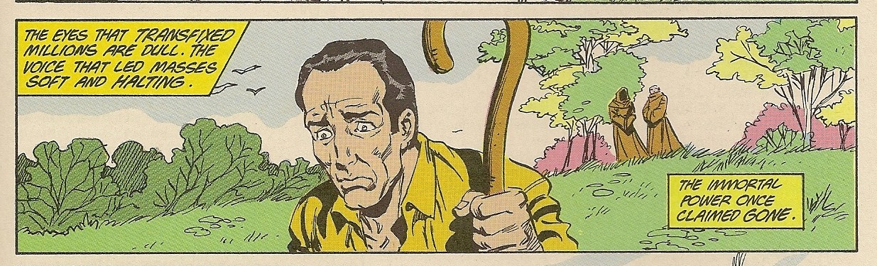 Then, well, as much as I think the idea of Brother Blood was kind of cool this drags it out so much and is a bit unrealistic. Yes, I get that he would try to get as much influence as possible and using Raven and Azrael to stage his ressurection on national television is a good ploy, but I find it a little hard to believe that he would rise to national prominence and have so many followers with such a harsh image. A more realistic portrayal of Blood and his church would have them be more of a “fake Christianity” kind of in the way that the reverend in the classic X-Men graphic novel God Loves, Man Kills. But if you’re going to have what’s basically a Satanic cult be a formidable enemy, you probably should have them always bubbling just below the surface and not be using 1980s sci-fi comically huge computer arrays to control the emotions and thoughts of the world.