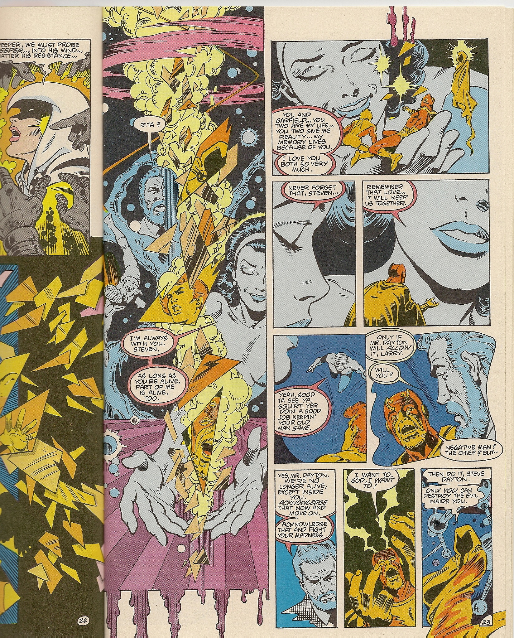 As for Mento … well, he finally, finally, FINALLY gets his due in issue #34. Raven “cures” him of his madnessk after he adds more to his Hybrid team and eventually the relationship he has with his son, Gar, is patched up, as is the relationship that Nightwing has with Starfire. It’s a bit of an anticlimax because he got shoved aside for the end of the Brother Blood storyline and then is brought back in an, “Oh, yeah, this has been going on for two years” sort of way.