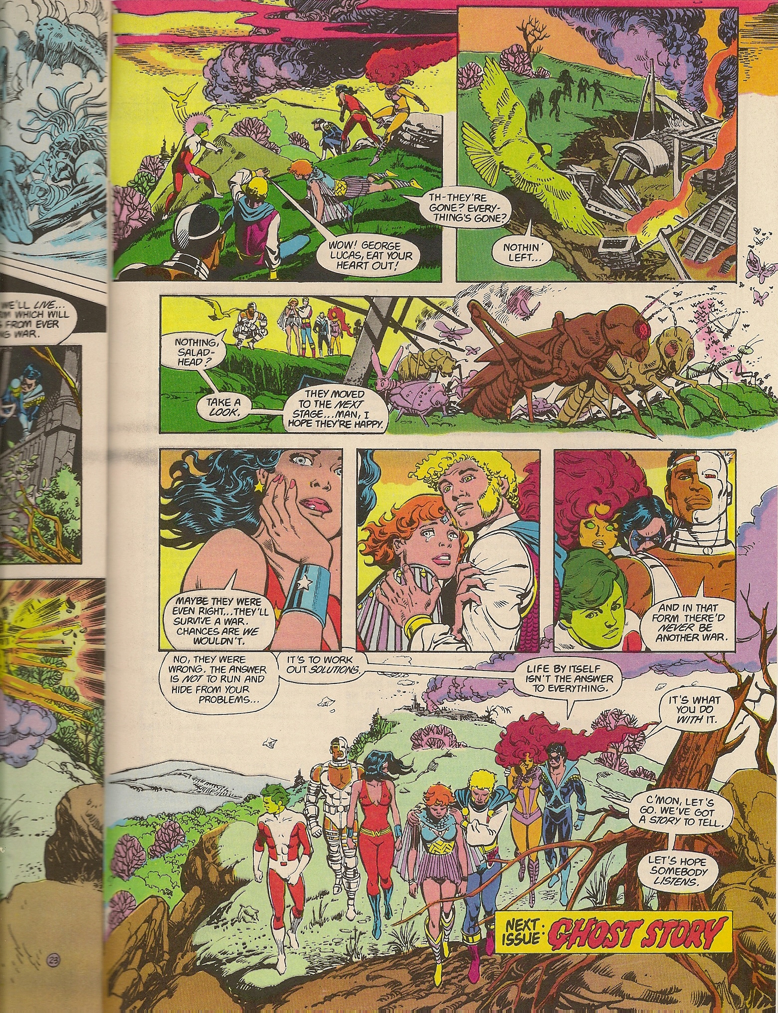 That is a short way of summing up the better part of a year and a half’s worth of stories, but honestly it’s an exhausting story to read and was an exhausting story to collect. I can see where Wolfman was getting a little burned out. He had set up three storylines that were going to break the team apart and pull them together–and they did, but it took incredibly long. I mean, Starfire is off-planet for the better part of a year and then makes her return in issue #26 but not before having the first couple of issues of the solo series Teen Titans Spotlight dedicated to her traveling to South Africa and learning about Apartheid. No, really, it’s one of those issues, because apparently she had become so warrior-like on Tamaran that she needed to be reminded that on Earth you don’t kill people and that Earth really is her home. I mean, I guess it’s a good reminder that deep down Kory is the passionate one who is a bit innocent and will always need to learn things about her new home, but it seems a little forced, as if she can prove to both the reader and her wayward boyfriend that she’s okay and she loves him and she’s a hero.