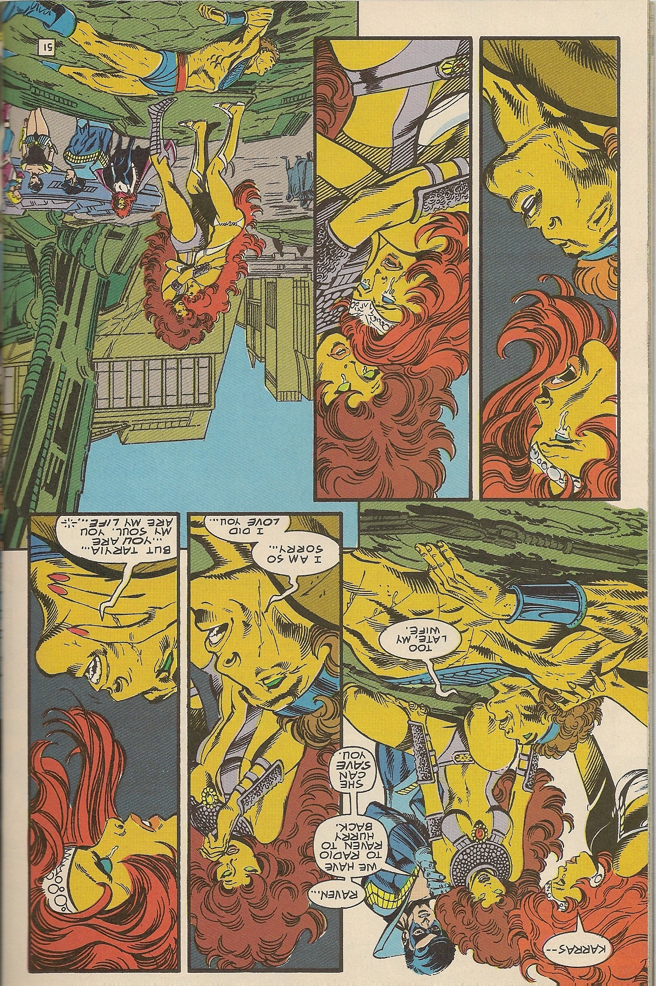 So let’s start with the Tamaran story since it is the first one of the three to get wrapped up. Basically, the reason that the ship has been sent to earth is so that the crew can bring Starfire back to her home planet where she is expected to marry Karras, the prince of the planet’s southern state. Doing so will prevent an encroaching civil war. As expected, this pisses off Nightwing and by issue #18 he winds up leaving the planet and heading back to Earth where he mopes around and gets into a fight with Donna before going off to find Raven. Starfire, meanwhile, doesn’t exactly have a good marriage because her sister is not only revealed to be alive but she leads a rebel army against her parents and a civil war does break out, ending in another smackdown between the two, except this time there is no winner. They are made to stop fighting and Blackfire is given control of the planet with her father as an adviser.
