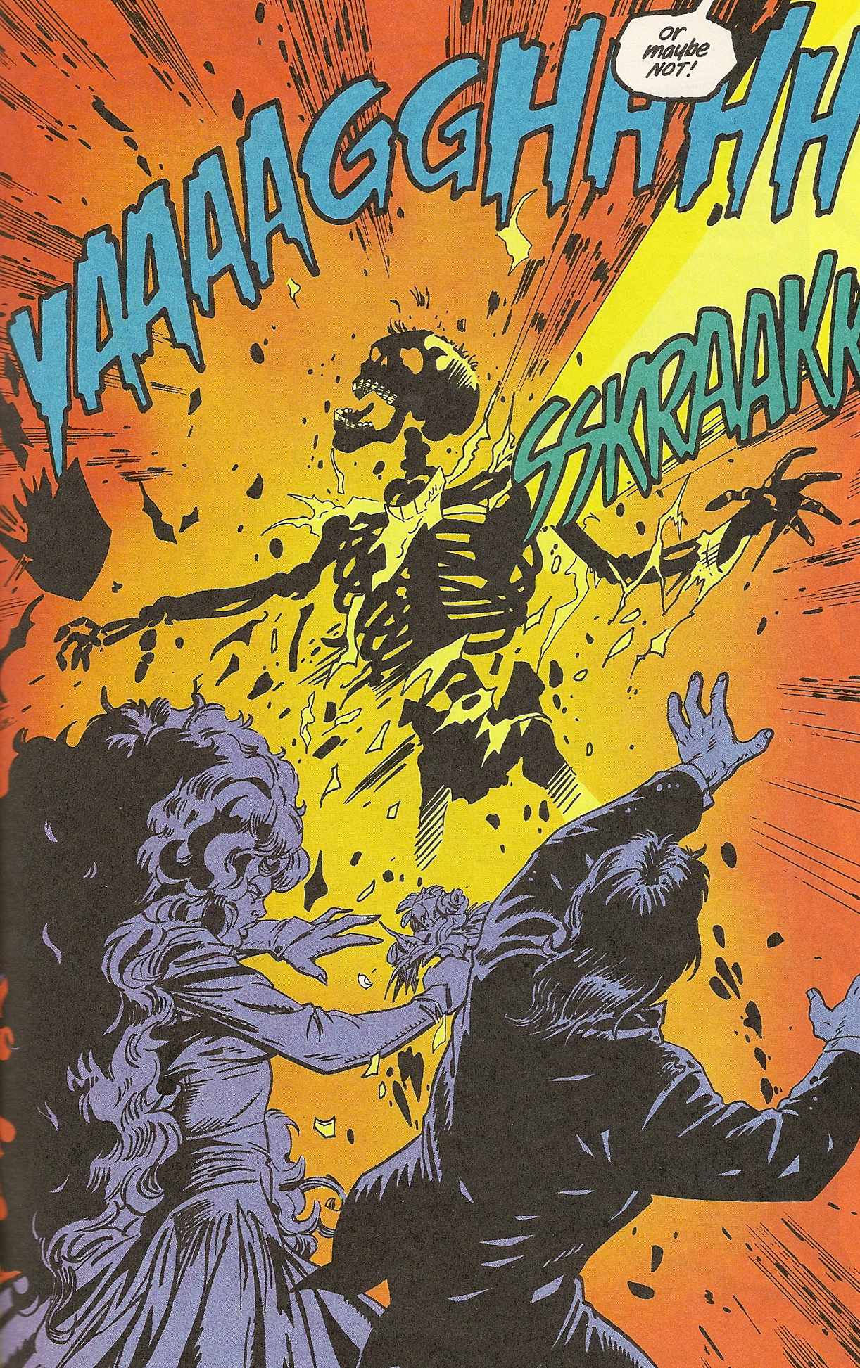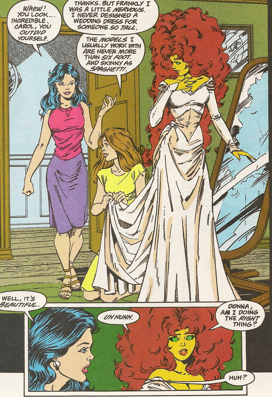 Back in New Titans #100, Dick and Kory are denied a marriage license because Kory’s an alien and City Hall finds something wrong in wanting to marry a six-foot tall orange-skinned alien with Eighties hair and a huge rack, Dick is insistent that they get married. It smacks of some sort of desperation to have his life in order and if that’s the case, then it makes total sense that he would have slept with Barbara because as tight as he wants to hold on, he keeps screwing up, something that even Donna Troy notices as the wedding is being set up on her farm and he’s about to blow a gasket when Alfred tells him that Bruce Wayne can’t come to his wedding. At least he calms down when Alfred tells him that Bruce has a broken back (and that, btw, is the only time Dick Grayson goes anywhere near Knightfall. But don’t worry, Bat fans, you’ll be seeing him on a regular basis in a little more than a year).