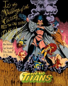 The poster was a comics shop poster that also made its way to a house ad that was included in that month’s issues, such as New Titans Annual #9, proclaiming that New Titans #100 featured the “wedding of the year” but it’s too bad that nobody invited Raven and showing the former-teammate-now-villain looming over the decimated Titans.