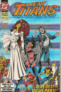 Considering that since its debut in 1984 with the epic return of Trigon storyline, the New Teen Titans series that would eventually would be renamed The New Titans with #50 had gone through many ups and downs and had nearly been canceled at least once, the fact that issue #100 was hitting the stands was something pretty remarkable. Also, the fact that Nightwing and Starfire were going to be married in issue #100 was something pretty remarkable because if you go all the way back to issue #1, they were shown in bed together for the very first time and that caused quite a stir in the lettercolumns.