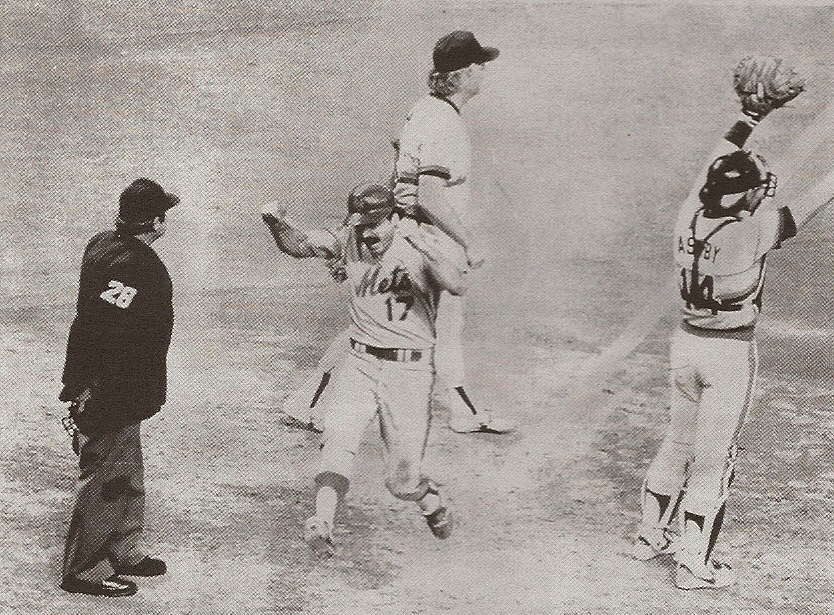 Truth be told, I was probably happy to get away from the game anyway, because Ron Darling had been smacked around in the first two innings and were losing 4-0. But Patrick’s mother had the game on in the living room and by the time we headed outside to play some party games, the Mets were losing 5-4 as the bottom of the ninth started. I remember that two or three of us excused ourselves from some game that involved wrapping people up in toilet paper to watch the end of the game, and came in when Astros manager Hal Lanier was in the middle of what seemed like an interminable argument with the first base umpire over whether Wally Backman had broken a rule by doing a sort of rolling slide into first base on a close play and was actually out, rather than being called safe.