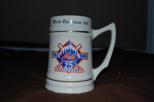 A 1986 Champions Stein. During my sophomore year of college, I went home on fall break and was hanging out with my friend Cathy. We were more or less completely bored and decided to head out to Roosevelt Field Mall to go shopping that weekend. Among the places we went were FAO Schwarz, where I bought a Stormtrooper stand-up (remember when those were a thing? I should do a post on that), as well as the Mets team store, which I had wanted to visit ever since I had heard about it. I walked out of the store that day with a 1986 Championship stein, which had the 25th Anniversary logo on the front and a rundown of the scores of the postseason games on the back, where I learned that although Roger Clemens started Game Two of the World Series and the Red Sox won 9-3, he is not credited with the win; that honor went to someone named Steve Crawford.