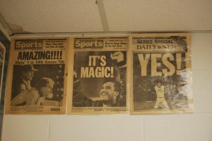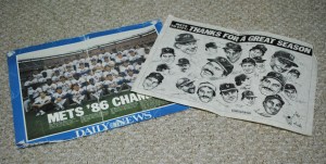 Newspaper covers and posters. If you look on the wall of my classroom, you will see a huge gallery of great New York sports moments newpsaper covers. I have the Giants’ victories in Super Bowl XXV and XLII as well as the Rangers’ 1994 Stanley Cup victory (Oh, I also have the “Earth to Invaders: Drop Dead” Invasion! edition of The Daily Planet). But up in the corner are the Daily News covers from Game Six and Game Seven of the 1986 World Series as well as a poster of the Newsday cover from Game Seven.