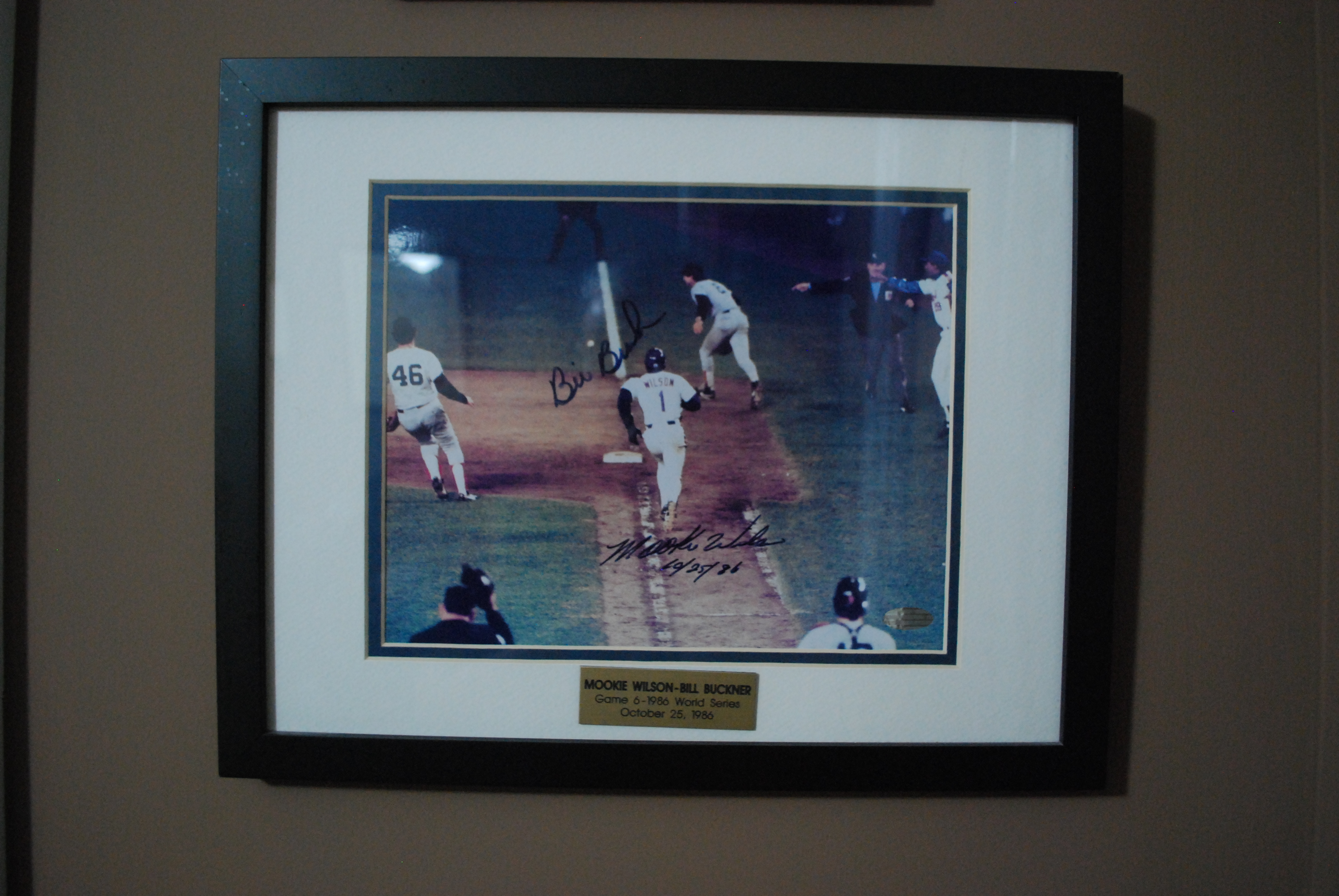 The Buckner-Mookie picture. If there’s a “showpiece” of my accidental collection of 1986 Mets merchandise, it’s the framed and autographed photo of the Buckner play that hangs on the wall of my guest room. My dad bought this for me for Christmas about ten or eleven years ago, and I have always thought it was one of the coolest pieces of sports memorabilia I have ever gotten. Granted, it’s not some airbrushed lithograph of Derek Jeter that you can buy at a stand in the SmithHaven mall, but it’s still an amazing piece, especially since Buckner himself signed it, which I think is kind of surprising considering how much grief he has taken for the play (in fact, a recent documentary on Steve Bartman started with the Buckner play).