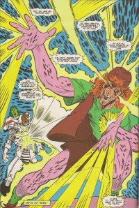 But the story really begins in New Titans #102, where Sarah Charles is trying to restore Vic and brings in the Team Titans’ ethereal computer guy, Prester Jon (my second-least-favorite Team Titan, something I’ll get more into next time) to try to interface with him, kind of in the same way that the Justice League used to use The Atom to go waaaayyyy down to somewhere small.  Meanwhile, Pantha digs deeper into whether or not Dayton Industries had something to do with her origin,  Dick and Kory are having their issues and Gar fights a monster called Sinn while he also fights against what seems to be indulging the fact that he can only seem to transform into monsters.  At the end of the issue, Sinn is revealed to be an agent of Raven, who is also manipulating Councilman Quirk, the replacement for Liz Alderman–which begs me to ask, if she was going to ruin the Titans’ public image all along, why remove Liz Alderman from the picture?