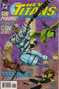 Unfortunately, the storyline that sends this particular strong member off is one of the weakest in the latter part of Marv Wolfman’s run, and one of the lowlights during the post-New Titans #100/pre-Zero Hour period (I’d call it the Bill Jaaska era, but most of the issues featured here actually aren’t drawn by Jaaska).  Entitled “Terminus: The Final Fate of Cyborg,” the story builds on what was established at the beginning of “The Darkening” with the apparent return of Rita Farr and villains that were not really villains but weird beings of light, and then goes bi-weekly for issues #104-107 in order to wrap everything up in a timely manner.