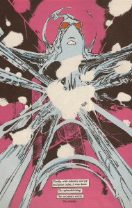 Back in Swamp Thing #60, which was written by Alan Moore with artwork by John Totelben, Swamp Thing was drifting through space and came upon an electronic-based alien and the two mate.  The particular Swamp Thing issue uses an unconventional (for comics, anyway) storytelling format, as Moore’s story is actual prose text instead of word and thought balloons and caption boxes against splash pages of Totelben’s almost-surreal art.  It’s some of DC’s best science fiction and a very interesting way to show comic book sex.  After the sex, Swamp Thing leaves the alien and she gives birth to their offspring.