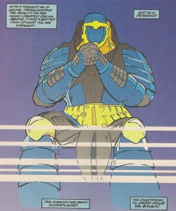 Anyway, the two, along with the teams that The Spectrum has collected, go after Lazarium and wind up stopping him and his soldiers–time-tossed Chaos troops that he had “super-powered.” Dagon delivers the final blow to the evil leader when he kills him in order to sustain himself, which is a good “out”, I guess, but under a good writer would be a great way to have a vampire with a moral dilemma. Nightrider was never my favorite character anyway, to be honest, especially since there were only so many directions the writers could take him.