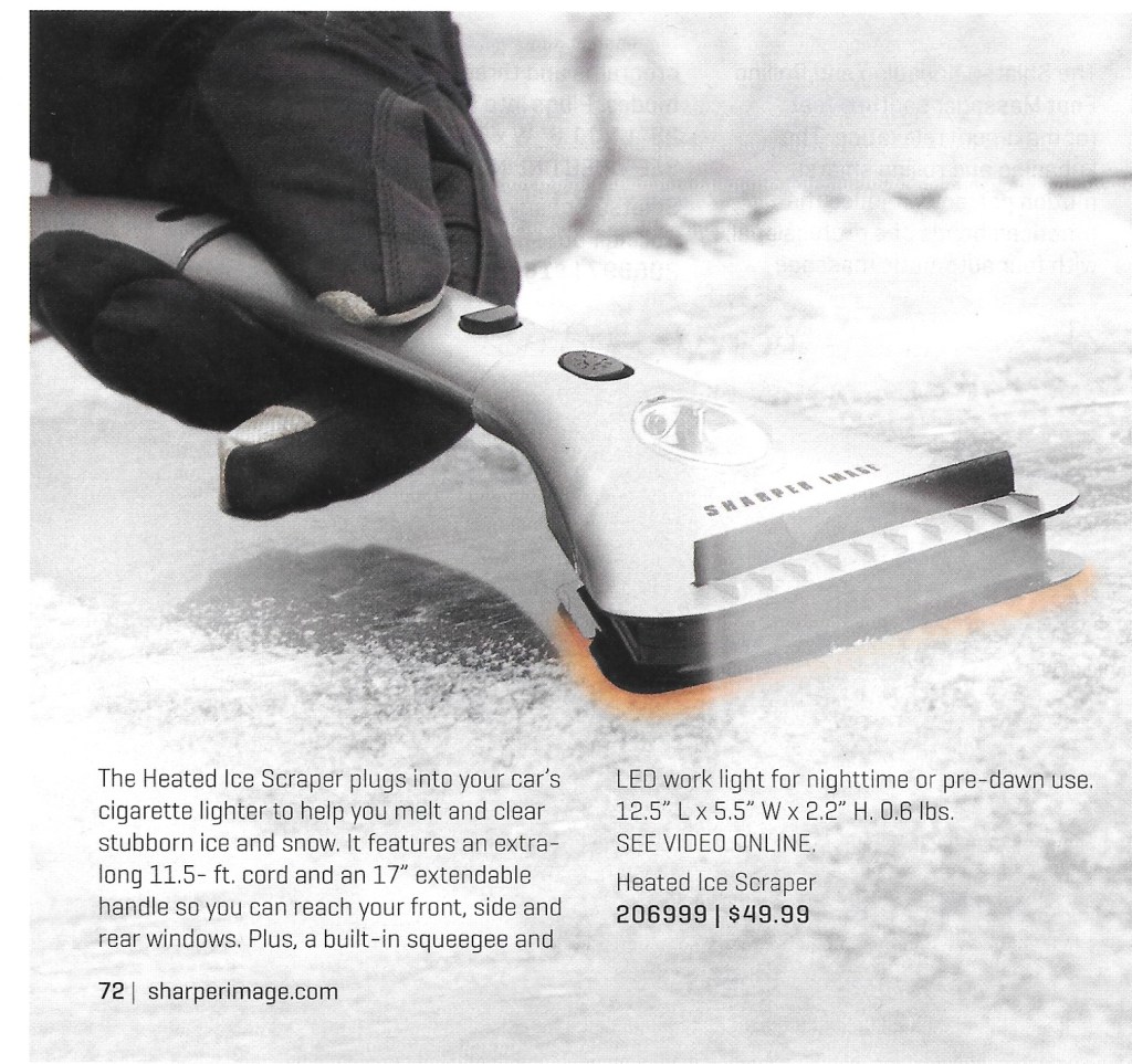 But if there’s one item that reminds me of The Sharper Image more than any other, it’s the Heated Ice Scraper. And I think that’s because my mom owned one at some point circa 1989-1990. In fact, I don’t think that they have changed the product’s description since the early 1990s considering they say, “The Heated Ice Scraper plugs into your car’s cigarette lighter …” The emphasis was mine there, but I guess their thought is that if the item has been selling itself for decades, then why change the sales pitch? And I think it worked? I might have tried to use it once but remember it not working well; then again, knowing that I was an oft-impatient putz as a kid, I probably didn’t use it right.