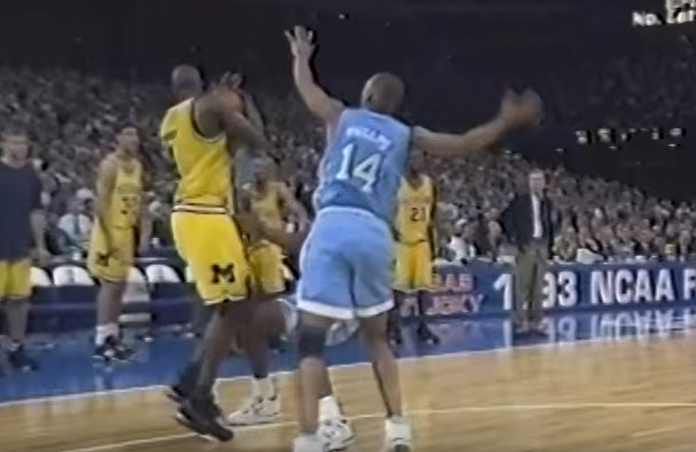 I have to say that I almost fast forwarded through the college football recap to get to the college basketball recap. I love the NCAA tournament and I think this year is the reason why. I’d probably paid attention in prior years and may have even filled out a bracket for the fun of it, but I distinctly remember watching a number of games from the 1993 game including the championship game between Michigan and UNC. And as you can see from the screencap, this is that championship, the one where the Fab 5 came storming in and took on a steadfast Carolina team that was coached by Dean Smith. There’s some great commentary by various sportswriters, talking heads, and players in the video about the competing styles of the two teams, and that’s before we get to the moment that anyone and everyone remembers. Down by two points with time running out, Chris Webber got a rebound off of a foul shot, took the ball down the court, and called timeout with hopes of setting up a play. However, Michigan was out of timeouts and that was a technical foul.