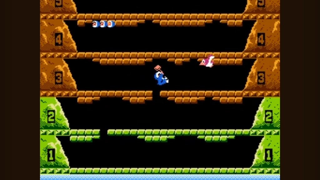 Anyway, this game is as silly as Balloon Fight and has a similar arcade concept. You play as a guy in a snow parka holding at ice axe and jump and chop away at the ice above you until you reach the top of a pyramid. You’re dodging a bunch of stuff along the way: enemies on each floor of the pyramid, birds dropping things, and increasingly slippery surfaces. I bought a copy of this game about 20 years ago when it was pretty cheap on eBay and have only ever been able to get trhough a few levels. Still, you have to love any game that doesn’t take itself too seriously.