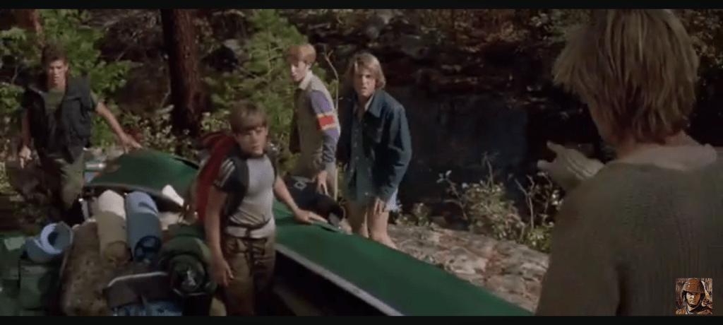 First, this is from toward the end of the movie. Mark says to “look closely at the canoe.” If you look right behind Sean Astin, you can see that there’s a gash in the canoe, which would have made the white water rapids climax impossible.