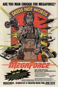 I first saw Megaforce on television when I was a kid.  Well, to be honest, I saw the last ten minutes of it.  Megaforce was one of those movies that netowrk affiliates would show when there was a hole in their schedules on a weekend afternoon because someone else was airing a baseball or football game and we weren’t in the era of all-golf, all-the-time on Saturdays and Sundays when Notre Dame isn’t playing.  Saturday is still kind of a wasteland, but back then it wasn’t half bad because you could every once in a while come across The Breakfast Club or Better off Dead on WPIX if your mom hadn’t chased you out of the house already.